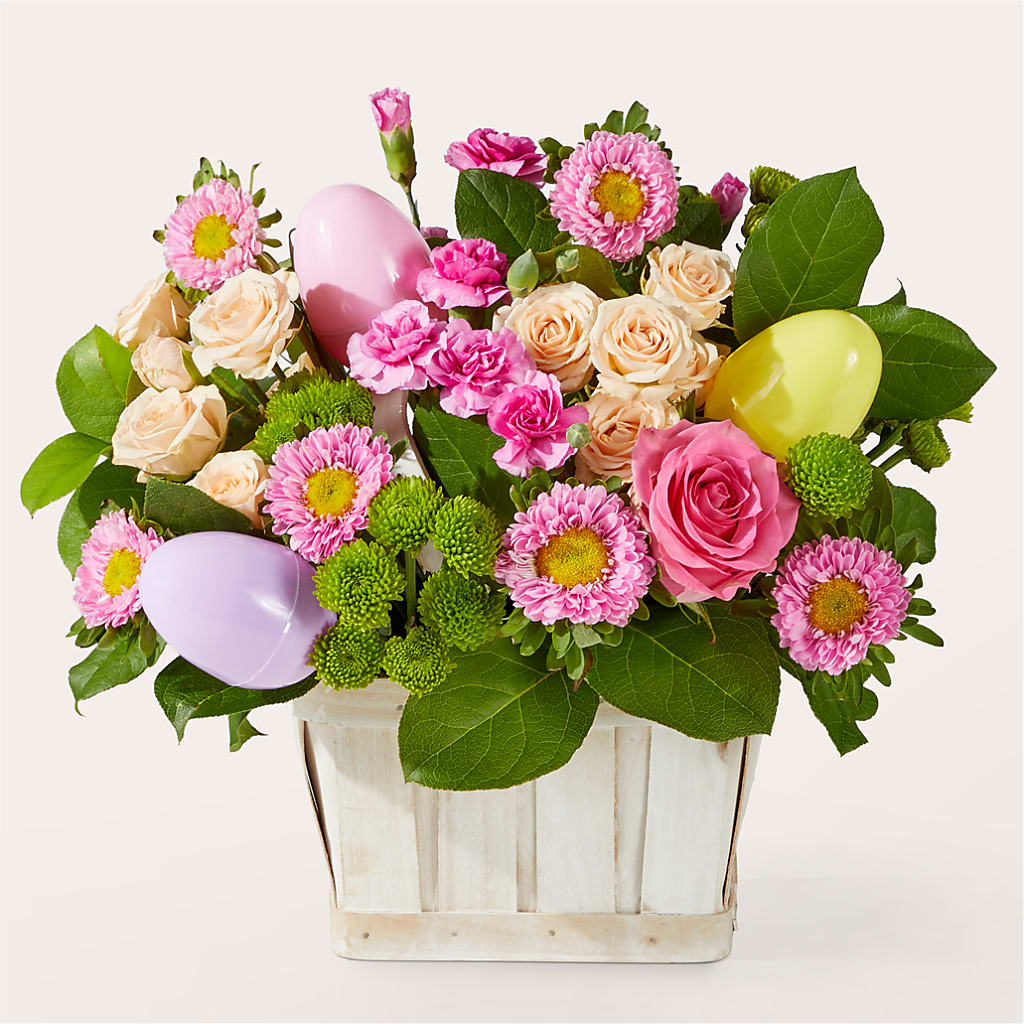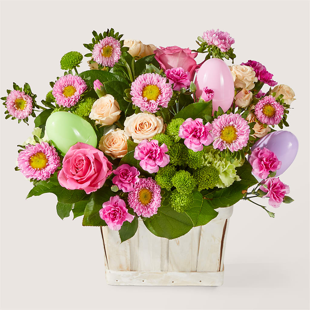 Hop to it and send them this adorable basket celebrating the spring & Easter season. Expertly arranged by your recipient's local florist, these roses, carnations and asters will bring the best blooms of spring to their doorstep.